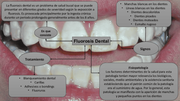 El flúor en «cantidades óptimas» detiene la caries en su fase inicial (mancha blanca) pues remineraliza el esmalte que ha sido afectado, además lo fortalece volviendo los dientes más resistentes a los ataques de la caries dental. Sin embargo, la ingesta prolongada de este mineral durante el desarrollo dental puede generar alteraciones en la formación del esmalte de los dientes permanentes.
