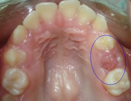 - Pérdida prematura de dientes de leche: si los dientes de leche se caen antes de tiempo y no se hace ningún tratamiento odontológico con un mantenedor de espacios (aparatología), tal como lo mencionamos en nuestro artículo ¿Por qué cuidar los dientes de leche si se van a caer?, los dientes de leche adyacentes pueden ocupar el espacio del diente perdido, tal como se muestra a continuación: